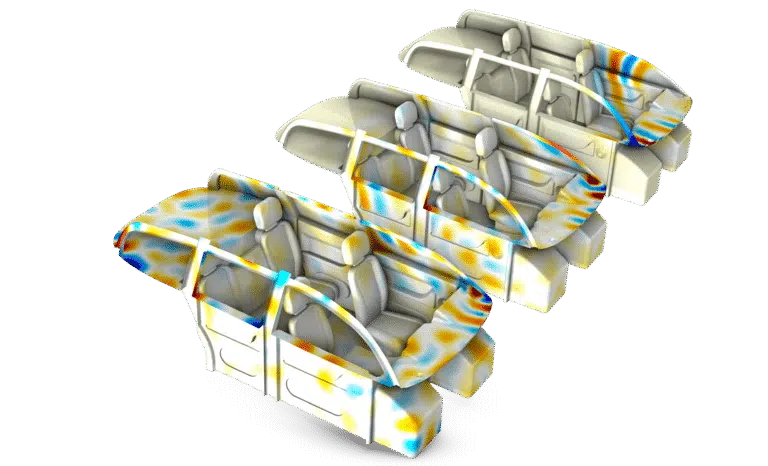 Les simulations acoustiques à bord, telles que celle d’habitacle de voiture montrée ici, bénéficient de l’accélération GPU NVIDIA® en version 6.4, ce qui permet des analyses plus rapides et plus extensibles.
