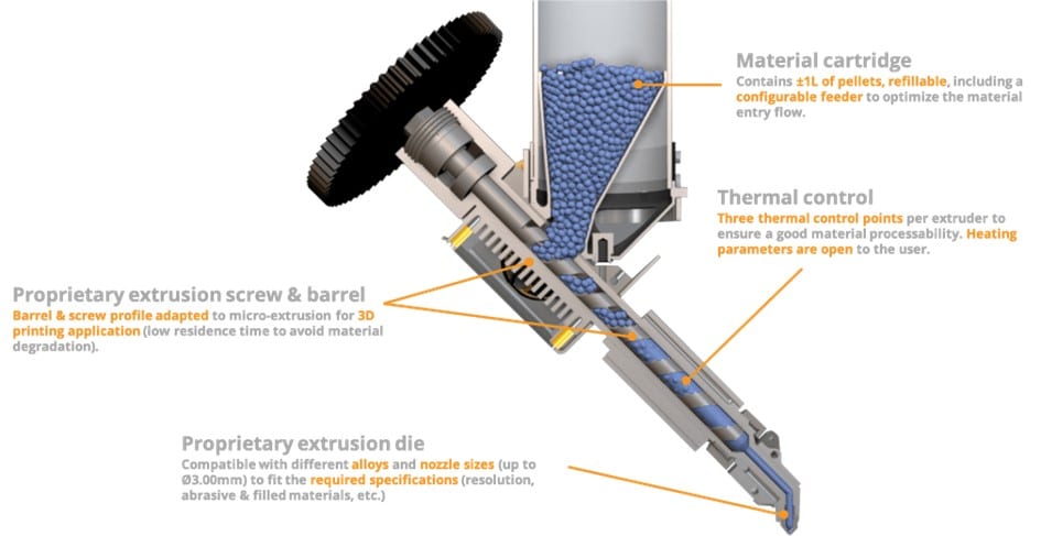 Ces machines font partie de la famille FDM (Fused Deposition Modeling – dépôt de fil fondu). Elles ont une tête dotée d’une trémie recevant les granulés, d’une unité de plastification thermorégulée avec vis d’extrusion, qui alimente la buse de dépose pour créer la pièce. Cette buse est entourée d’un plateau chauffant permettant de maintenir la dernière couche déposée à la bonne température pour faciliter l’accrochage de la suivante. (Voir schéma) Ces machines modulaires peuvent aussi recevoir des têtes permettant de faire du CIM (Ceramic Injection Molding) ou du MIM (Métal Injection Molding), mais il faut alors délianter puis fritter les pièces obtenues, pour leur conférer les propriétés mécaniques attendues.
