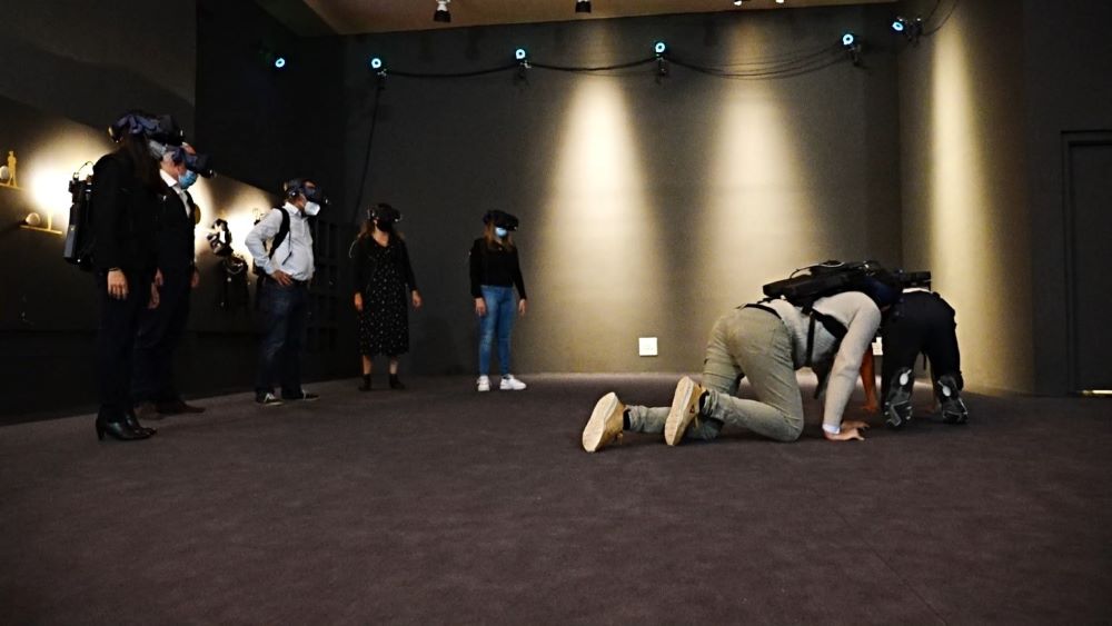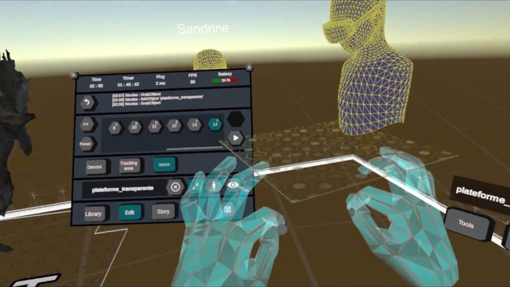 Pour arriver à cela, chaque casque de réalité virtuelle a été doté d’une caméra de tracking détectant la position des mains de l’utilisateur, quand il les place dans son champ de vision. En mode Auteur cela permet d’accéder à l’interface utilisateur de l’application pour créer ou modifier du contenu. Lors de cette phase, toutes les parties prenantes chargées de créer l’expérience 3D se retrouvent dans la salle et s’équipent avec les sacs à dos et les casques de RV. Ils sont ainsi directement immergés au cœur du modèle 3D et accèdent du bout des doigts à l’interface de création du logiciel où se trouve le story board de la visite envisagée, avec ses parcours de déambulation, ainsi que des bibliothèques de modèles d’objets et de décors en 3D qui peuvent être intégrés dans les scènes d’un simple clic. Il suffit alors de choisir et paramétrer toujours du bout du doigt les outils de liaison entre les différentes scènes (télé-porteurs, plates-formes mobiles, ascenseurs…) pour raconter une histoire de manière fluide.