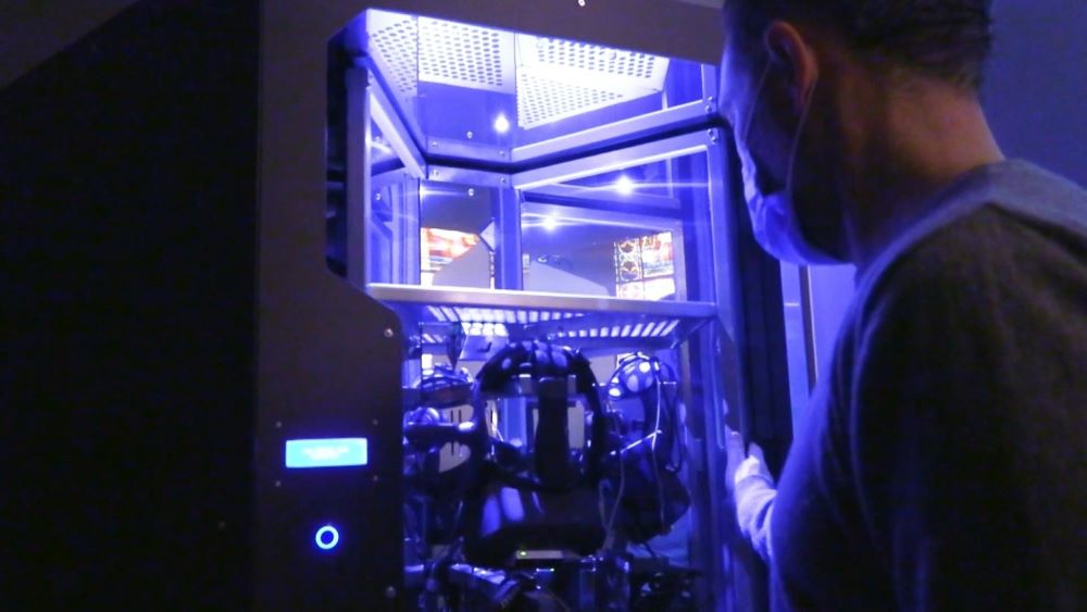 Une machine de désinfection sur-mesure Les mesures sanitaires imposent de désinfecter l’ensemble du matériel utilisé par chacun des 6 visiteurs (casque de réalité virtuelle et sac à dos avec l’ordinateur) après chaque séance. |