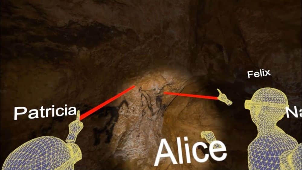 Alors que l’on est habituellement seul dans ce genre d’expérience, ici nous sommes 6 et chacun voit dans son casque les avatars de ses coéquipiers d’aventure, sous forme de maillage surmonté de leur nom. Cela permet d’interagir avec les autres visiteurs et surtout avec le guide-conférencier. Il suffit de lever le doigt, ce qui lui permet de nous identifier, et de pointer à l’aide d’un faisceau laser fixé au bout de notre doigt, le détail sur lequel on souhaite des explications.