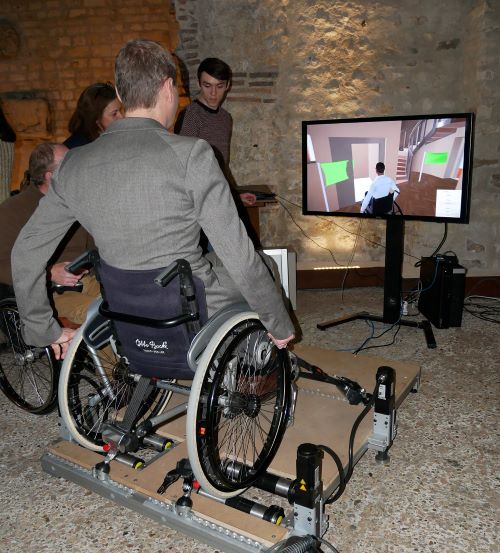 Afin de rendre l’expérience de réalité virtuelle plus immersive, les ingénieurs ont créé avec le Centre de Ressources et d’Innovation Mobilité Handicap (CEREMH), un véritable simulateur physique. Il s’agit d’une plate-forme carrée dont les 4 coins sont équipés de vérins pneumatiques. Deux bancs à rouleaux sont placés à l’arrière de la plate-forme. Ils reçoivent les deux roues d’un vrai fauteuil roulant, qui est sanglé sur la plate-forme.