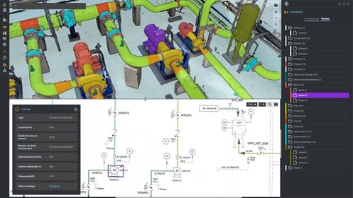 Reste que disposer d’un modèle 3D exact issu de la numérisation de l’existant, fût-il photoréaliste, ne répond qu’en partie aux attentes des industriels. Il faut pouvoir apporter de l’intelligence aux tuyauteries et équipements qui le compose. « C’est ce que permet notre solution grâce à l’utilisation de l’IA. Dans les industries de process, l’eau et l’énergie en particulier sur lesquelles nous nous focalisons, les P&ID sont au cœur de leur métier. Après plusieurs années de R&D, nous avons déposé un brevet qui protège notre technologie. Nous y utilisons l’IA pour deux choses. D’une part, reconnaitre automatiquement au sein du nuage de points global, les sous-ensembles de points qui correspondent à un élément physique, tuyauterie, vanne, pompe, équipement, etc., ainsi que les connexions physiques qui les relient. D’autre part l’IA sait aussi ‘‘lire et comprendre’’ les P&ID correspondant à l’installation. Il suffit alors de créer un ancrage sur de gros équipement entre le nuage de points 3D et le P&ID, pour que l’IA puisse remonter les lignes de tuyauterie avec tous les composants qui les parsèment, et leur apporter de l’intelligence. De proche en proche, c’est le nuage de point global de l’installation qui va devenir intelligent. »