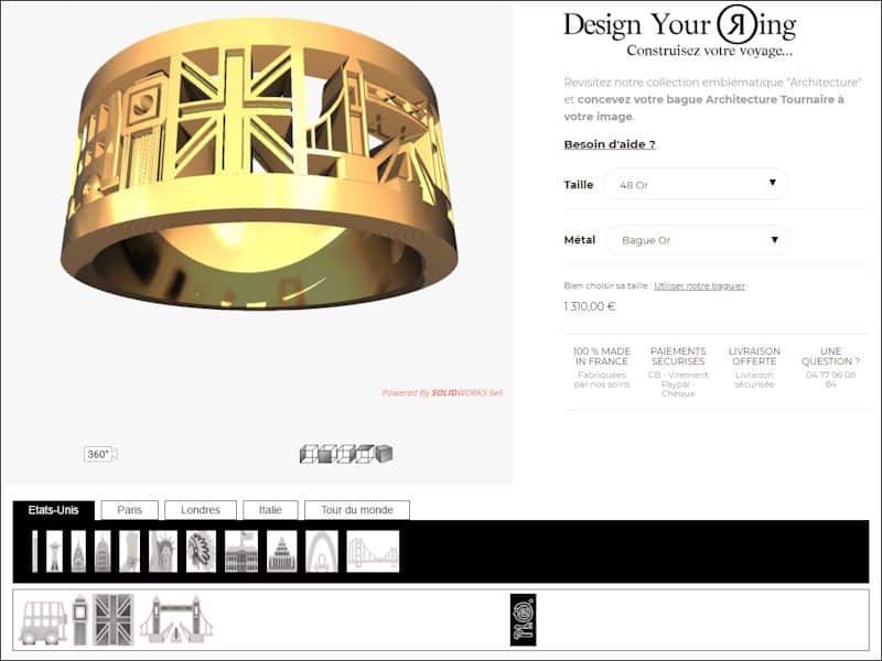 Mais pour le moment Tournaire a décidé de confier à ses clients la conception de leur propre bague dans sa gamme Architecture. Il s’agit d’un modèle relativement simple où une série de monuments stylisés sont insérés entre deux anneaux pour former une bague rappelant un pays. Il existe des modèles ‘‘standards’’ et des modèles ‘‘personnalisés’’ où le client choisi avec un styliste les monuments qu’il souhaiterait voir figurer sur sa bague. « Grâce à SolidWorks, nous avons décidé d’aller plus loin en donnant la main à nos clients avec l’application Design Your Ring, directement accessible sur notre site web, afin de personnaliser leur bague en ligne, de manière intuitive ».