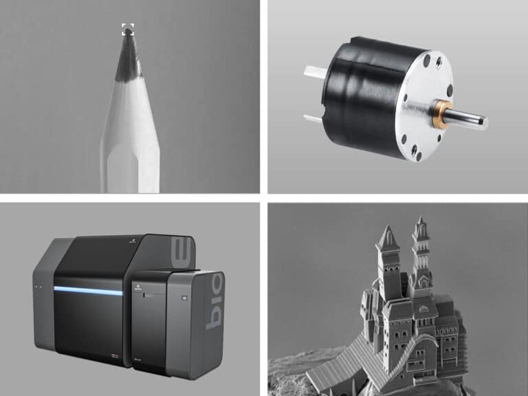 milliardième. Mais des pièces encore plus fines sont aussi possibles, comme les formes filigranes qui sortent de l’imprimante 3D NanoOne de la société UpNano. Pour fabriquer ces pièces, des particules de lumière sont projetées sur le matériau de départ, un processus qui se déroule à l’échelle du millième de millimètre. Pour cela, le substrat doit être orienté avec précision : une tâche délicate assurée par trois moteurs compacts haute performance de FAULHABER.